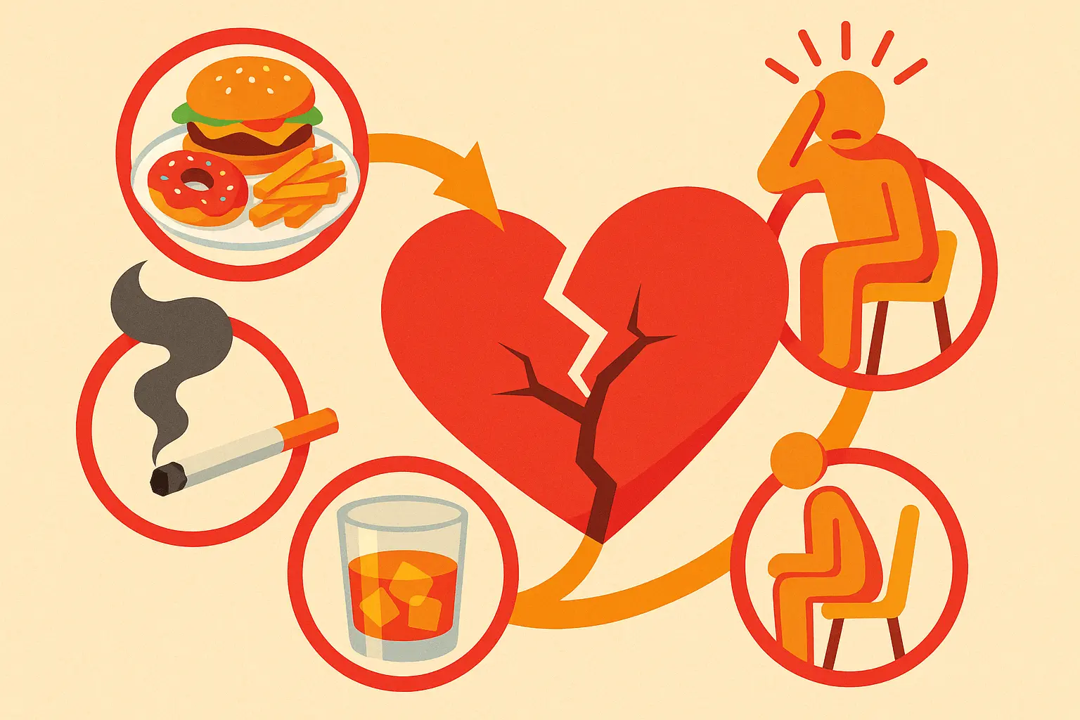 An unhealthy lifestyle makes the heart work harder than it should. Extra fat, high sugar, and lack of exercise narrow the blood vessels and disturb circulation. Stress hormones raise blood pressure, while smoking and alcohol damage the arteries. Together, these habits silently create serious heart conditions like coronary artery disease, hypertension, and even heart failure.